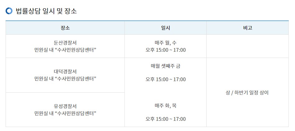 현재는 둔산경찰서, 대덕경찰서, 유성경찰서 3곳에서 운영중입니다.  대전지방변호사회 소속 변호사들이 무료법률상담을 실시하고 있습니다.