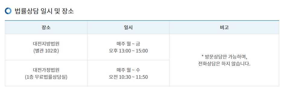 • 상담방법: 대전지방변호사회 소속 변호사와 1:1 대면 법률상담 지원 (1인당 30분)