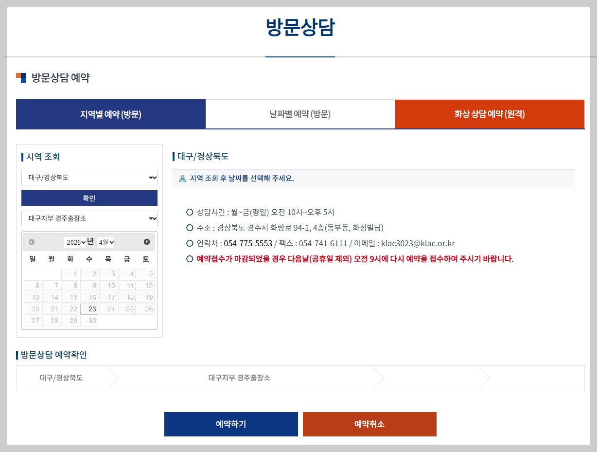 - 상담장소: 대한법률구조공단 경주출장소(경상북도 경주시 화랑로 94-1, 4층)