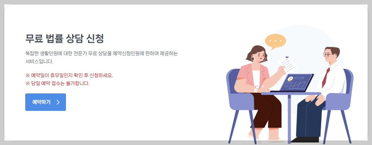 - 신청방법: '무료법률상담 신청하기'를 통한 온라인 예약 및 전화 문의