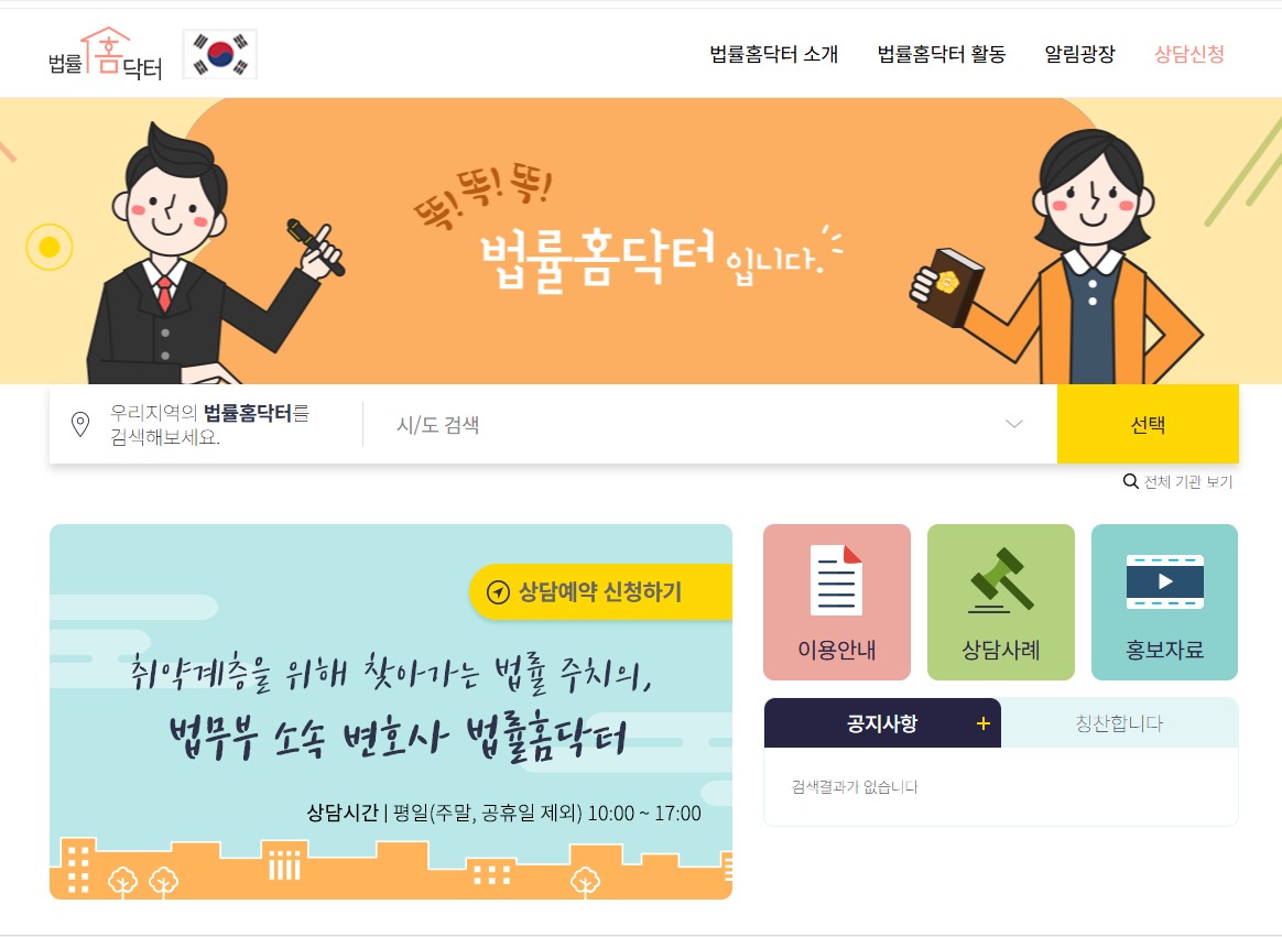 법무부에서 운영하고 있는 법률홈닥터 제도를 이용하시면 청주 이혼상담 무료로 받을 수 있습니다.