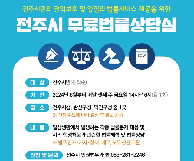 - 상담장소: 전북특별자치도청 1층 희망법률상담실