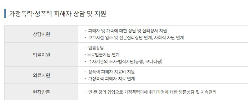 그 중에서 법률상담을 통해 무료법률지원을 연계해주며, 수사기관의 조사, 법적지원(동행, 모니터링)을 하고 있습니다.