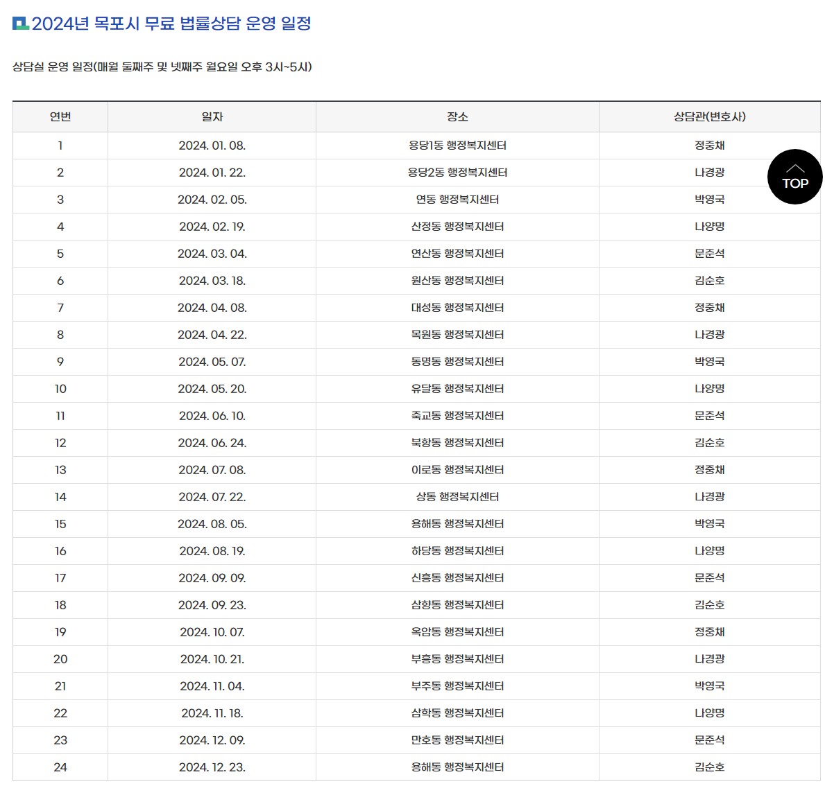- 상담내용: 목포 시민들의 생활과 직접 고나련된 행정, 민사, 형사 가사사건에 관한 사항, 시의 행정처분과 관련된 법률상담 및 법률해석 등에 관한 사항