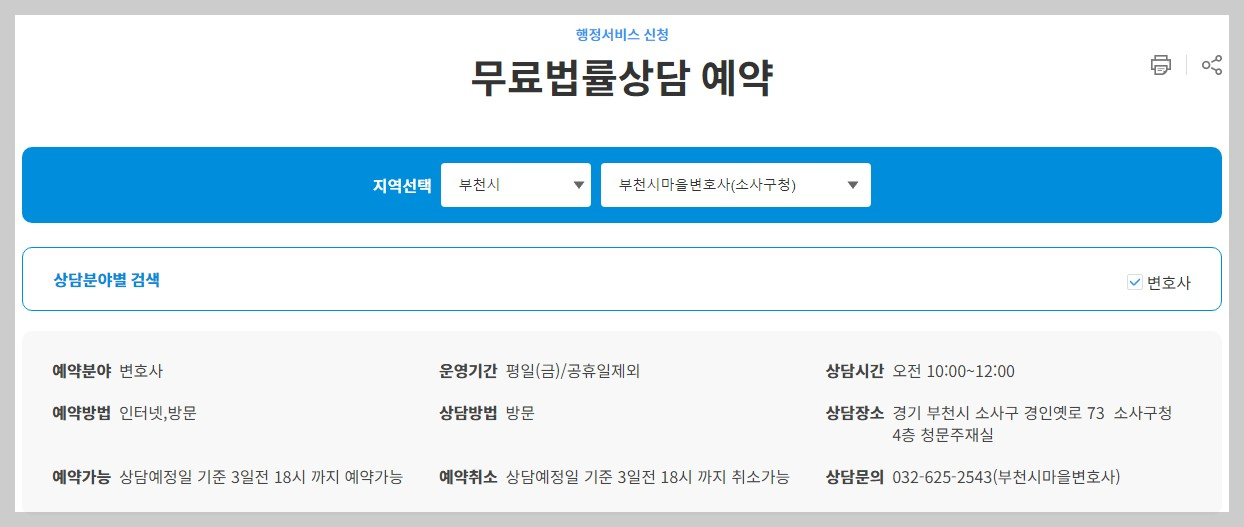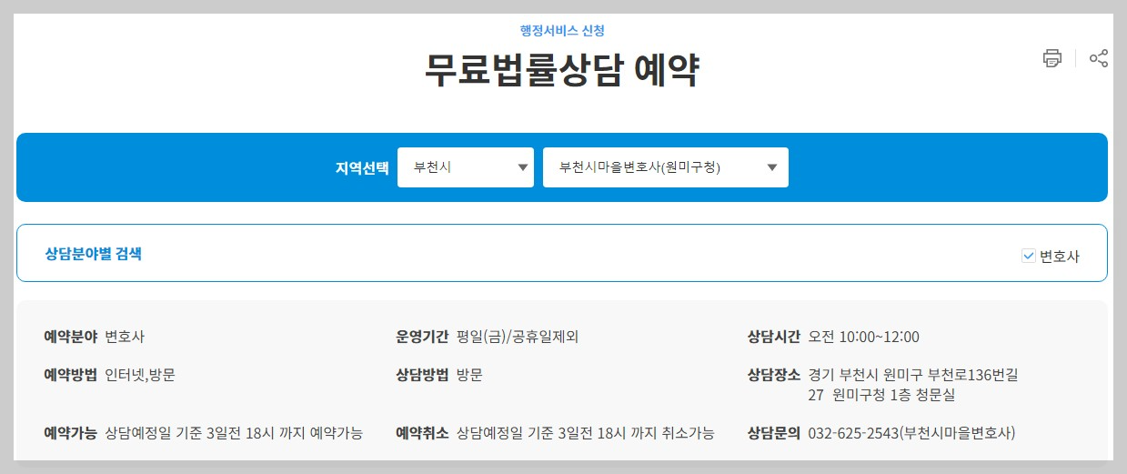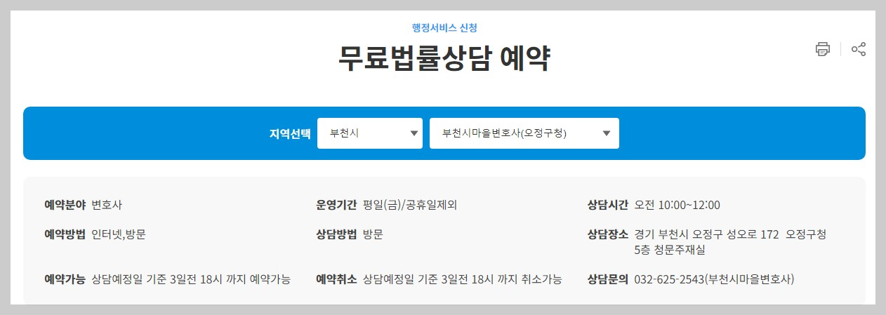 그 외에 소개해드린 원미구, 소사구, 오정구에서 운영하는 무료법률상담의 경우, 사전 예약을 하셔야 하는데요. 경기공유서비스 무료법률상담을 통해서 사전예약을 진행하시면 됩니다.
