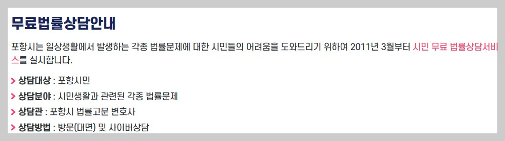 -이용방법: 평일 10시~17시까지 포항 법률홈닥터가 있는 포항시청으로 문의하기! 온라인에서 상담예약 신청가능!
