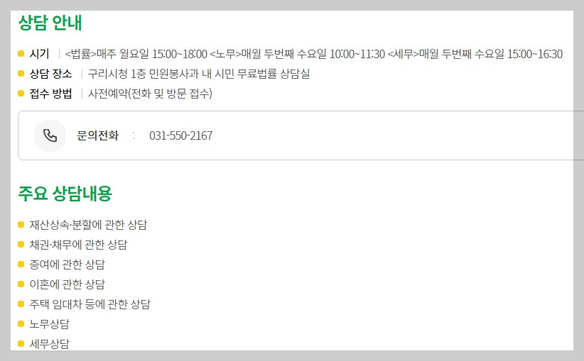 - 상담장소: 구리시청 1층 민원봉사과 내 시민 무료법률상담실