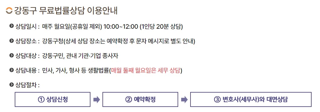 강동구민들은 서울시민들이 이용할 수 있는 무료법률상담센터도 이용할 수 있습니다. 또한 대한법률구조공단 무료상담을 활용하는 방법도 있사오니 참고하시기 바랍니다.