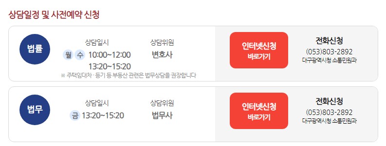 - 상담장소: 대구달서구청, 대구 동구청, 대구 북구청, 대구 수성구청, 대구 중구청