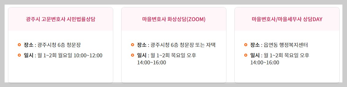 - 상담장소: 경기도 광주시청 2층 법률홈닥터 상담창구