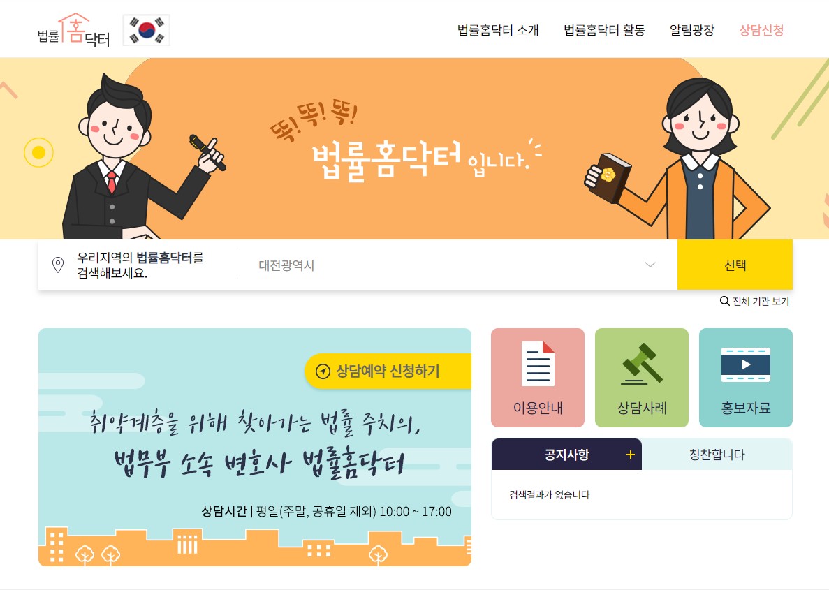 - 상담장소: 대전광역시청 법률홈닥터실, 대전 동구청 법률홈닥터실, 대전 유성구청 법률홈닥터실