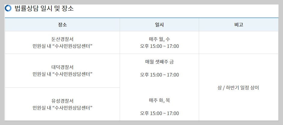 - 상담장소: 대전광역시청 법률홈닥터실, 대전 동구청 법률홈닥터실, 대전 유성구청 법률홈닥터실