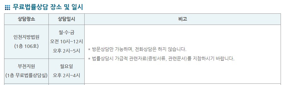 - 상담장소: 인천지방법원 1층 106호