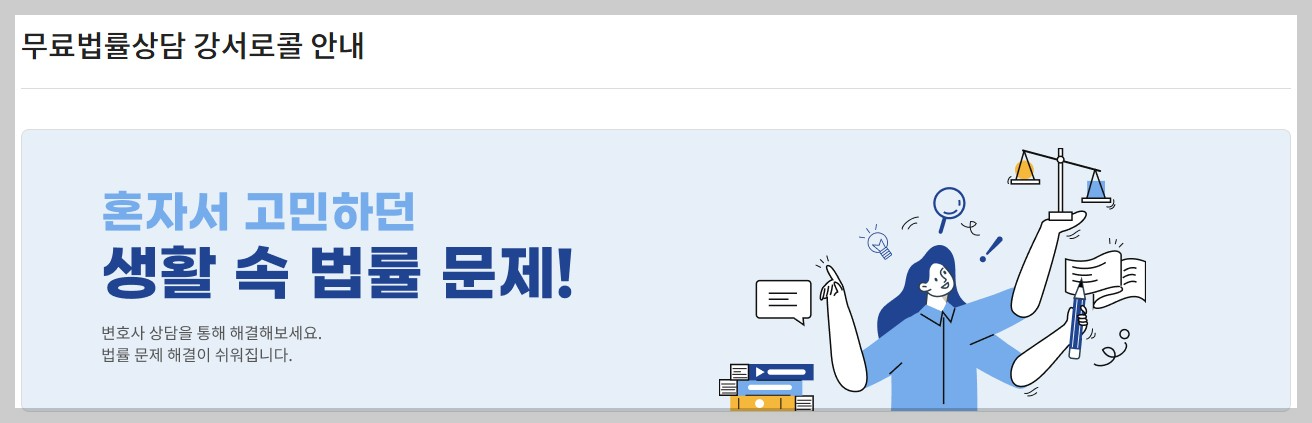 오늘은 강서구 변호사 무료상담 이용방법을 강서구 무료법률상담센터를 활용하는 것으로 알려드렸습니다. 우리 주변에서는 이렇게 무료로 법률상담을 받을 수 있는 서비스들이 있습니다.