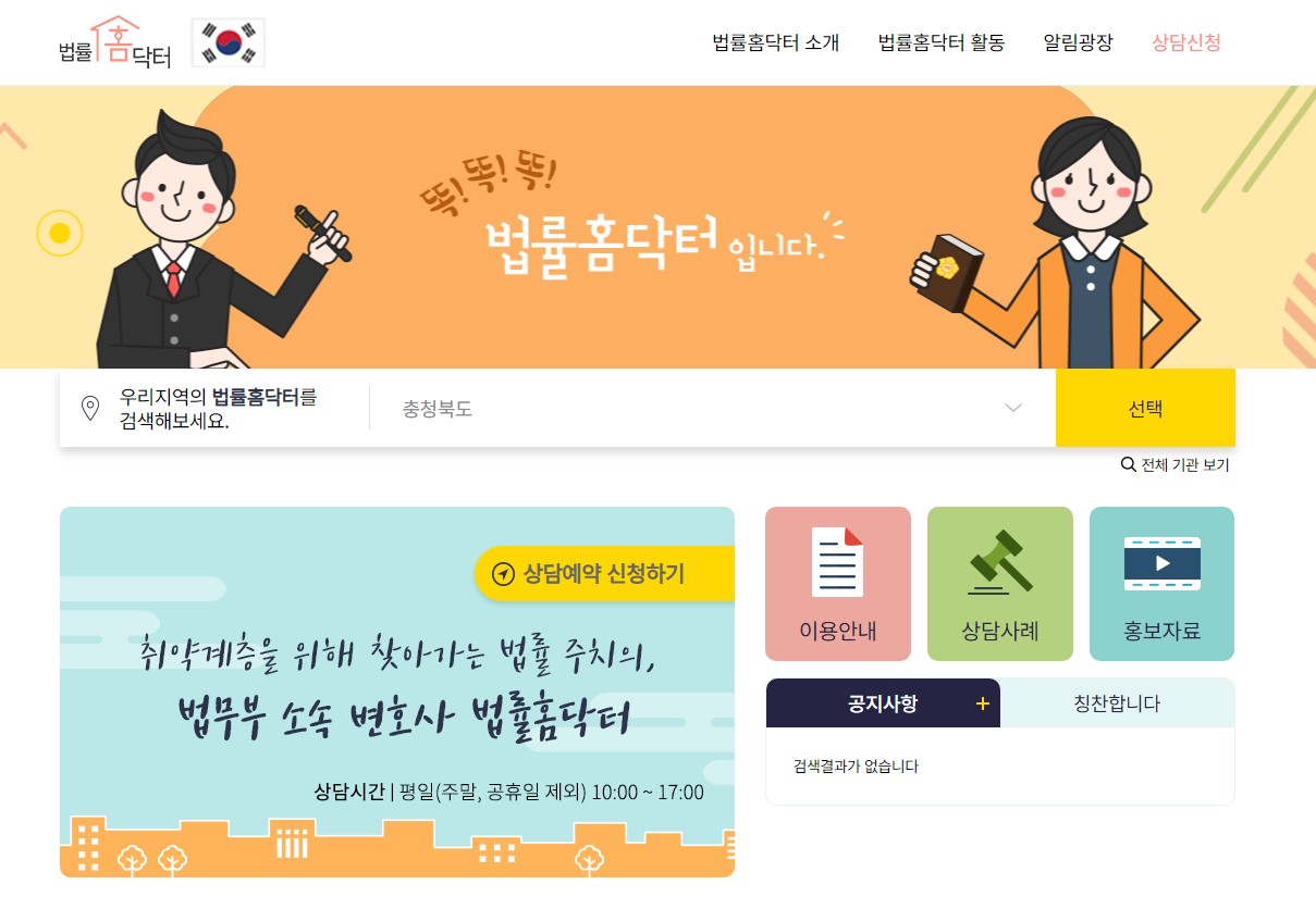 마을변호사제도 외에도 법무부에서는 법률홈닥터라는 법률서비스를 제공하고 있습니다. 사회적으로 경제적으로 어려운 취약계층을 대상으로 충주 변호사 무료상담을 이용할 수 있는데요. 사전예약을 통해서 법률홈닥터에게 무료법률상담을 받아보세요.
