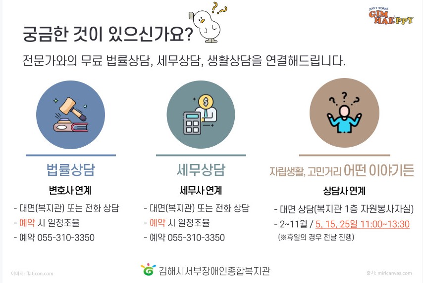 - 상담장소: 김해시청 행복민원청사 2층 상담실