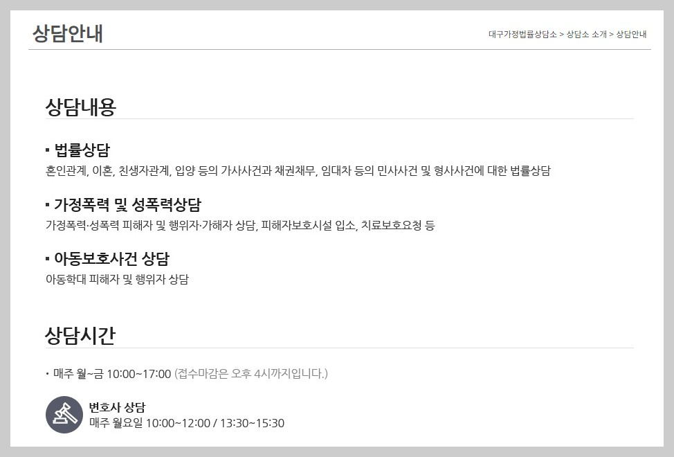- 신청방법: 대구가정법률상담소 홈페이지 또는 전화로 예약