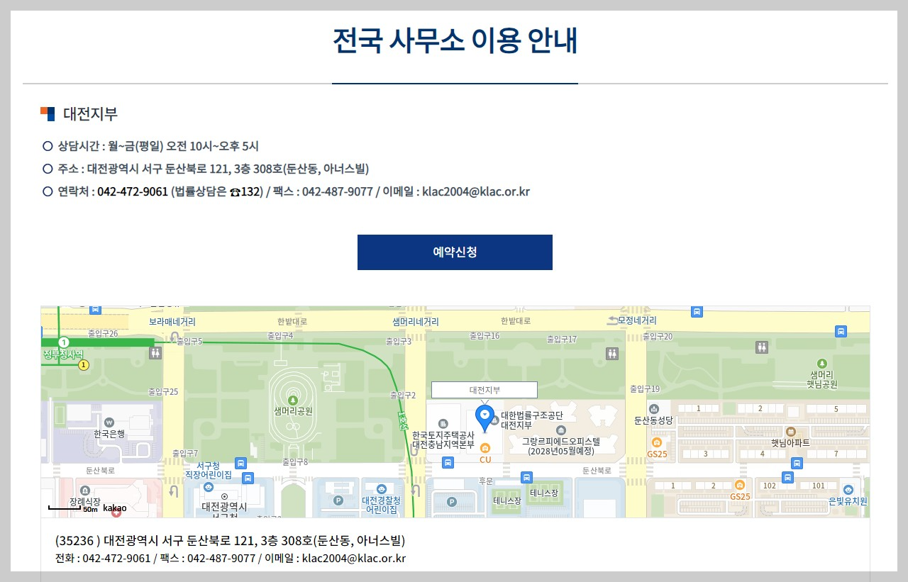 - 상담장소: 대한법률구조공단 대전지부 (대전광역시 서구 둔산북로 121, 3층 308호)