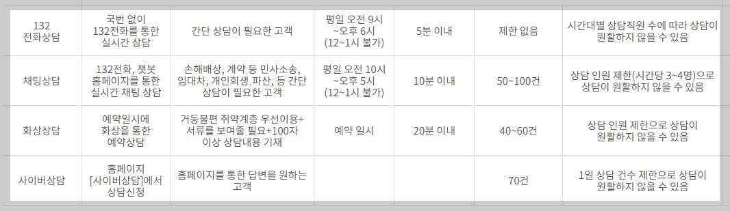 - 이용방법: 132전화, 챗봇 홈페이지를 통한 실시간 채팅상담