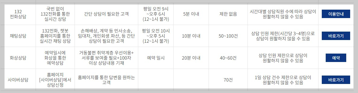 • 이용방법: 132 전화, 대한법률구조공단 홈페이지 챗봇을 통한 실시간 채팅