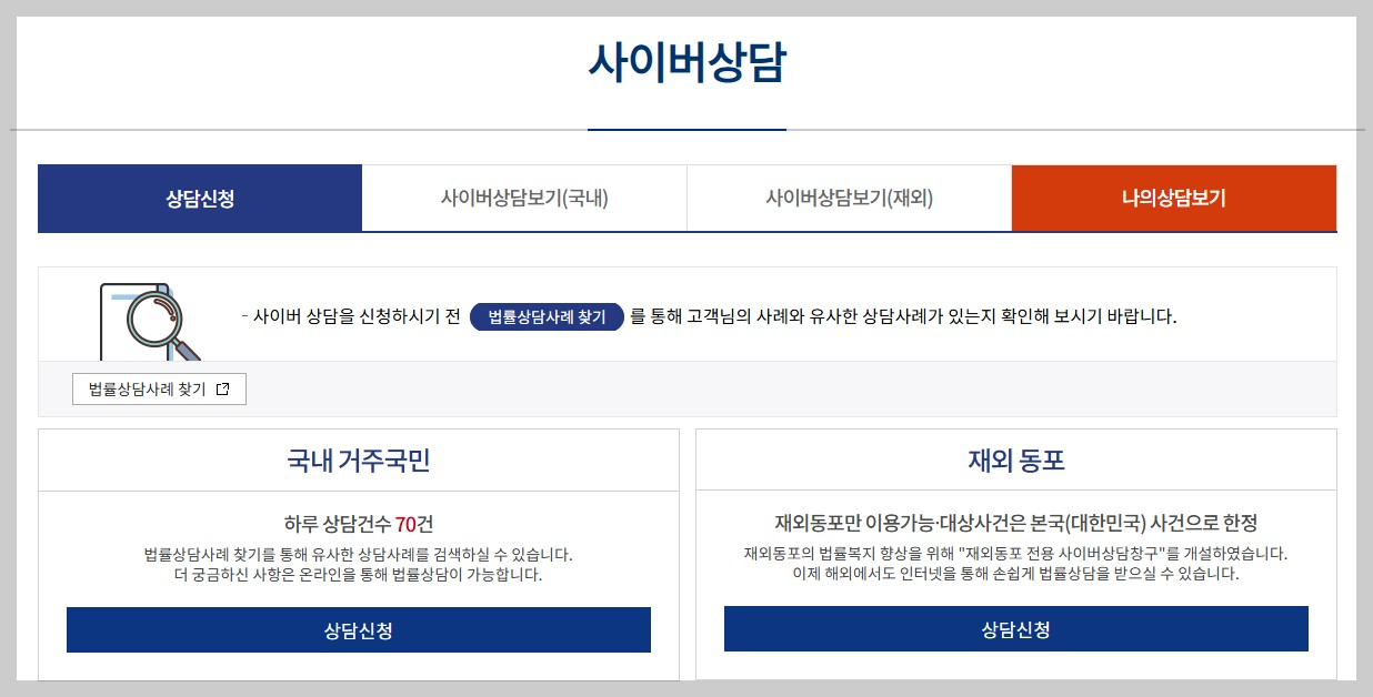 - 이용방법: 대한법률구조공단 사이버상담게시판에 상담글 남기고 며칠 후 답변받기