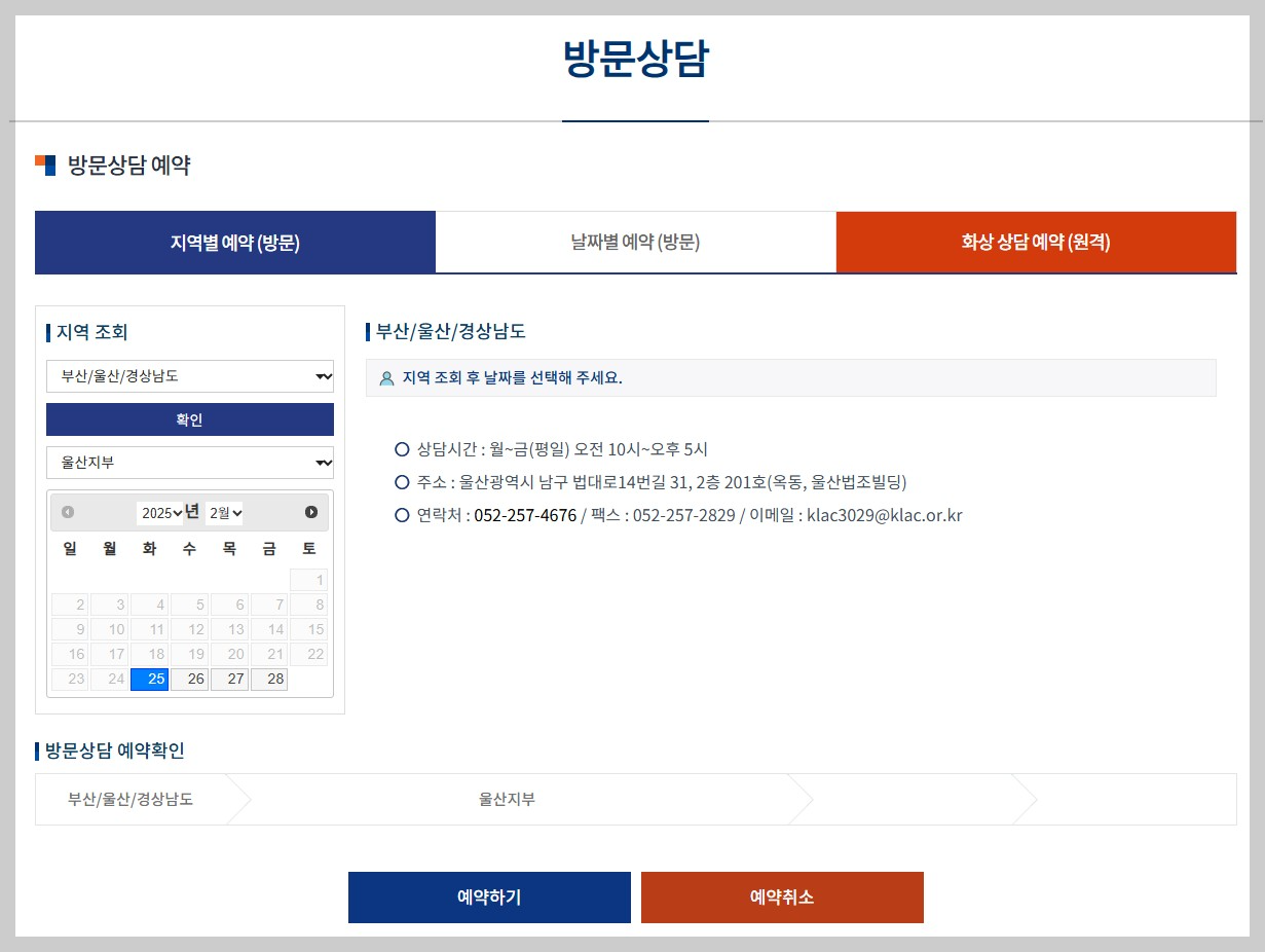 - 상담장소: 대한법률구조공단 울산지부(남구 법대로 14번길 31, 2층 201호