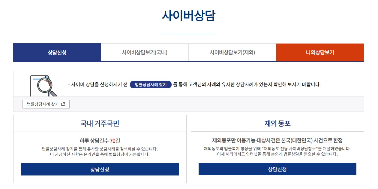 법적 분쟁이 복잡한 사안이라면, 비대면 상담으로는 사이버상담을 추천합니다.