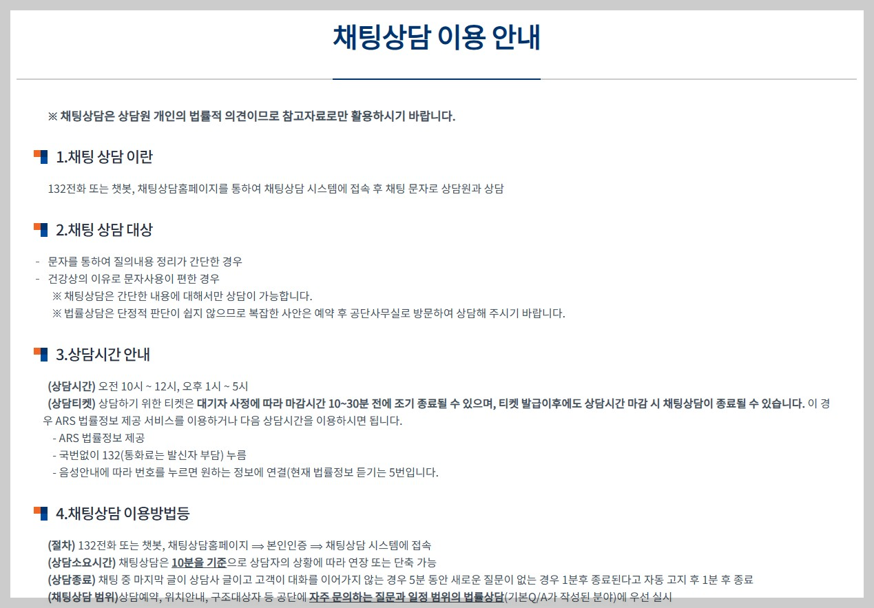 전화상담도 혹시 어려우신 분들은 실시간 채팅상담으로 무료법률상담을 받을 수 있습니다.