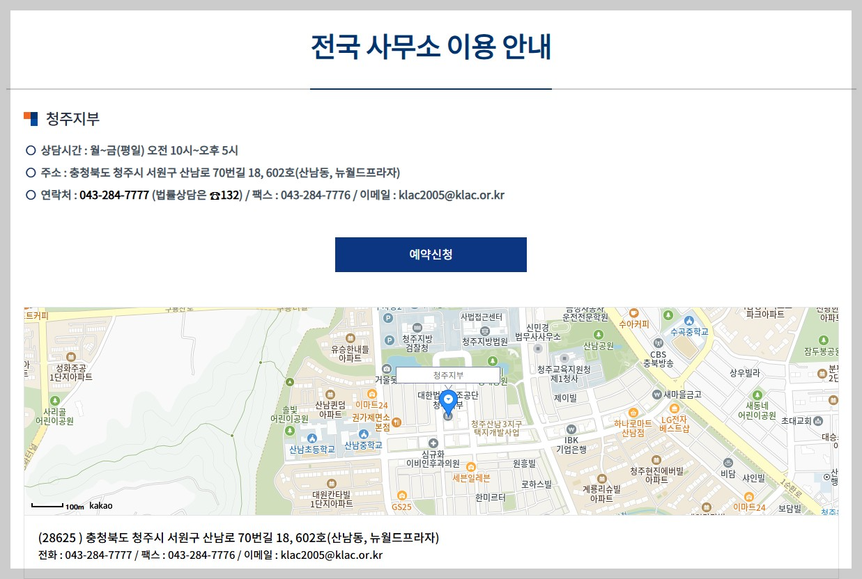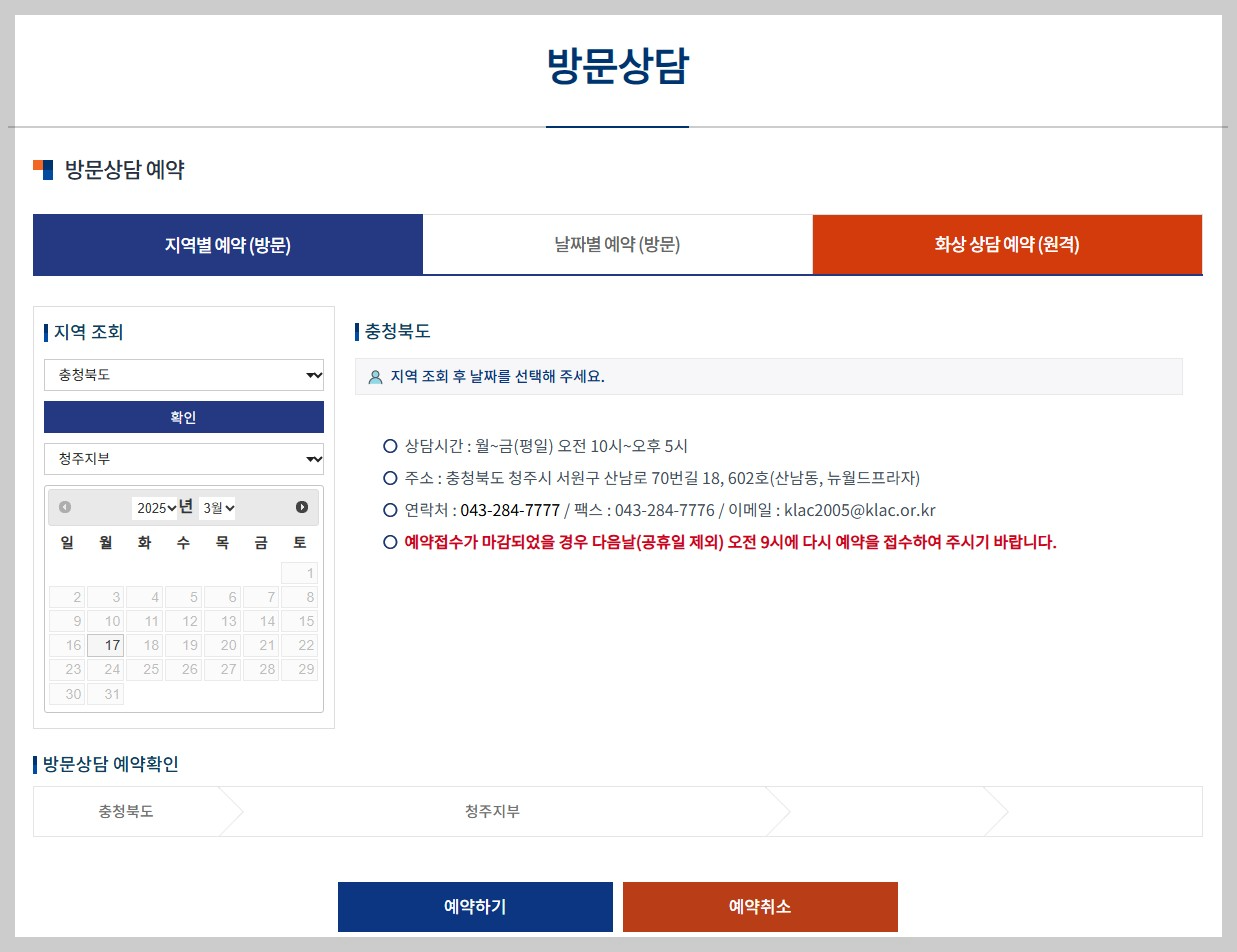 단, 대한법률구조공단 청주지부 방문상담을 원하시는 분들은 사전예약을 하셔야 합니다.