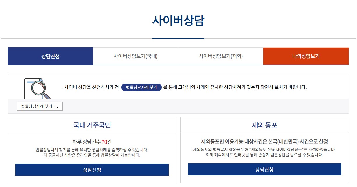 • 신청방법: 대한법률구조공단 홈페이지 사이버상담게시판에 상담글 남기고, 답변받기
