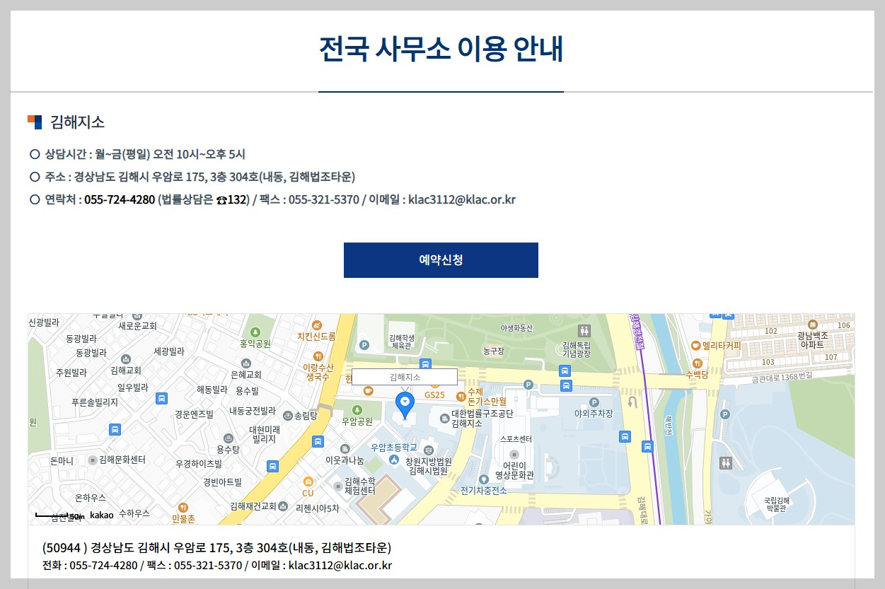 대한법률구조공단 김해지소에 직접 방문해서 상담받기 원하신다면, 사전예약을 꼭 진행해주세요.