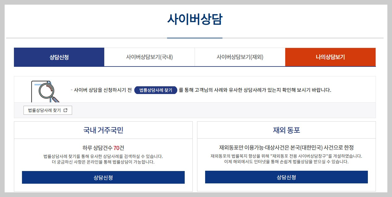 - 신청방법: 대한법률구조공단 홈페이지에서 사이버상담 게시판으로 이동, 상담글 남기고 답변받기
