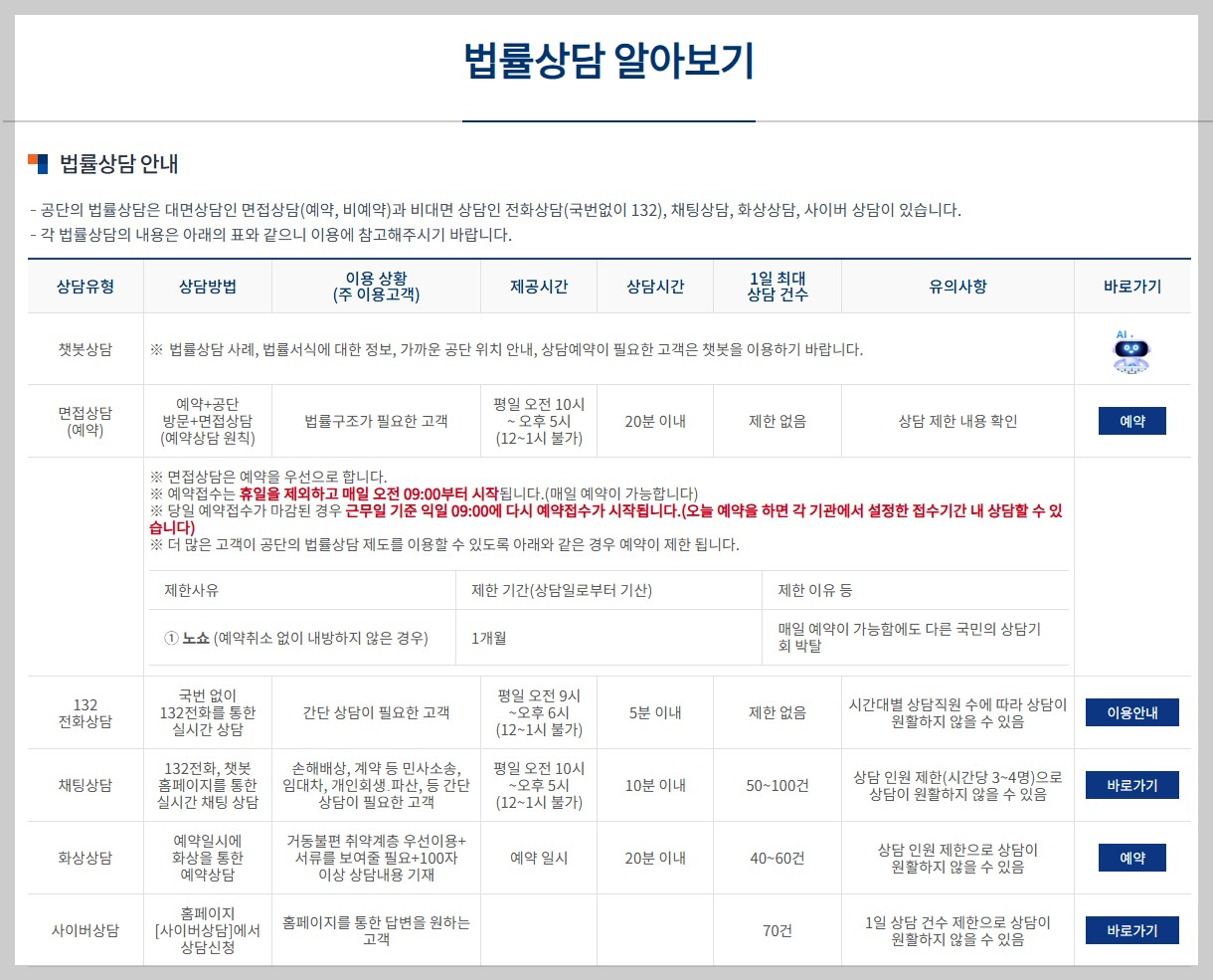- 상담대상: 간단한 생활법률 상담이 필요한 경우, 문자로 상담받는 것이 편한 경우