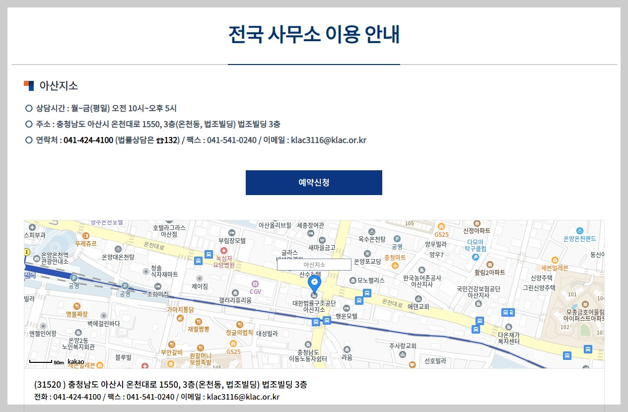 - 상담장소: 대한법률구조공단 아산지소 (아산시 온천대로 1550, 3층)